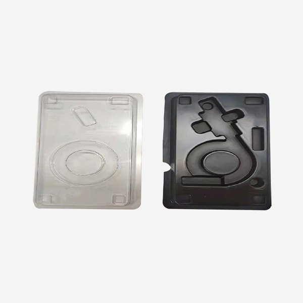 此产品为电子元配件E包装,盖子使用半导透明塑料材质吸塑而成,底盘使用黑色永抗塑料材质。